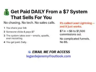 Tired of systems that promise big results but leave you guessing what to do next?Most people don’t fail online because the opportunity doesn’t work. They fail because there’s no structure, no follow-up, and no real support once they join.This program is different.For a simple $7 one-time investment, you get access to a complete lead generation system that pays you $6 per sign-up when someone joins through your link.Yes — $6 per lead. Unlimited.Here’s what you receive after joining:• Your own landing page ready to share• A built-in AI autoresponder that automatically follows up with your leads• Pre-written emails already loaded into the system• A simple step-by-step process to follow daily• Tracking so you can see your activity• No selling required — just share your linkThe AI follow-up system works behind the scenes when someone opts in, increasing your chances of turning interest into commissions without you chasing anyone down.You don’t need tech skills. You don’t need sales experience. You don’t need to create funnels or write emails.You simply share your link, the system captures the lead, and automated follow-ups do the heavy lifting.This is commission-based. Your income depends on how consistently you share your link and generate traffic.If the idea of earning $6 per sign-up from a $7 entry makes you curious, take a closer look and review the details.Serious inquiries only.If you’d like the link, email:legardejeremy@outlook.comReview the information and decide if it makes sense for you.