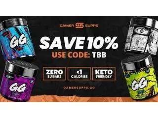 GamerSupps GG Energy is a gaming-focused energy supplement powder with zero sugars, less than 1 calorie per serving, and keto-friendly formula. Use code TBB at checkout to save 10% on your order. Visit gamersupps.gg/tbb to shop all flavors including Blue, Grenader Grape, Misfits Melon, and more.