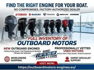 Your Trusted Source for New and Used Outboard Motors — All Major Brands, Shipped WorldwideBoats - Ships - - April 27, 2026Finding the right engine should never be a compromise. We are a factory-authorized dealer with a full inventory of outboard motors for sale from Yamaha, Suzuki, Honda, Tohatsu, Mercury, and Evinrude ranging from 2 HP to 300 HP in both 2-stroke ...